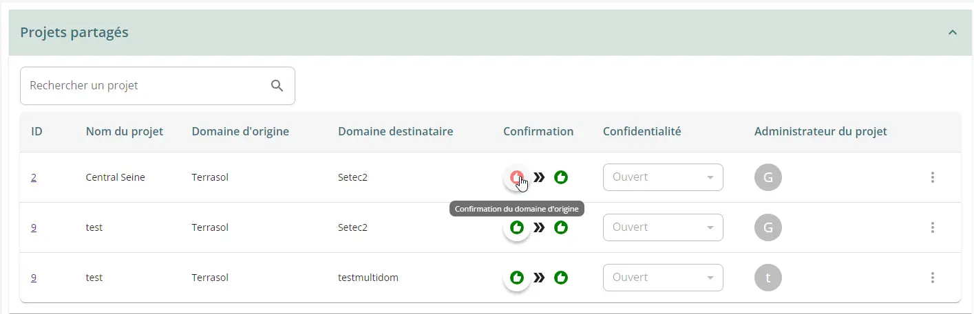 If a user has requested that a project in your domain be shared with another, you must validate that you accept this sharing by clicking on the👍 icon.