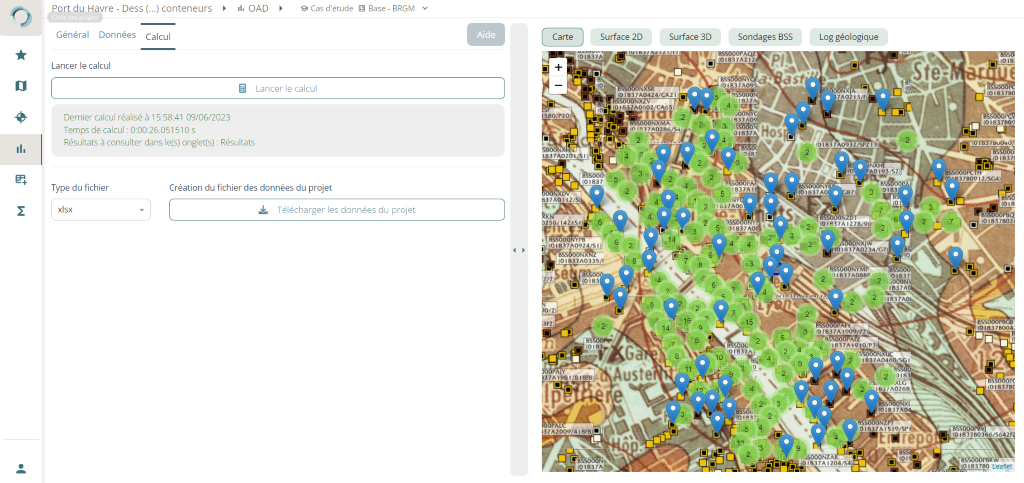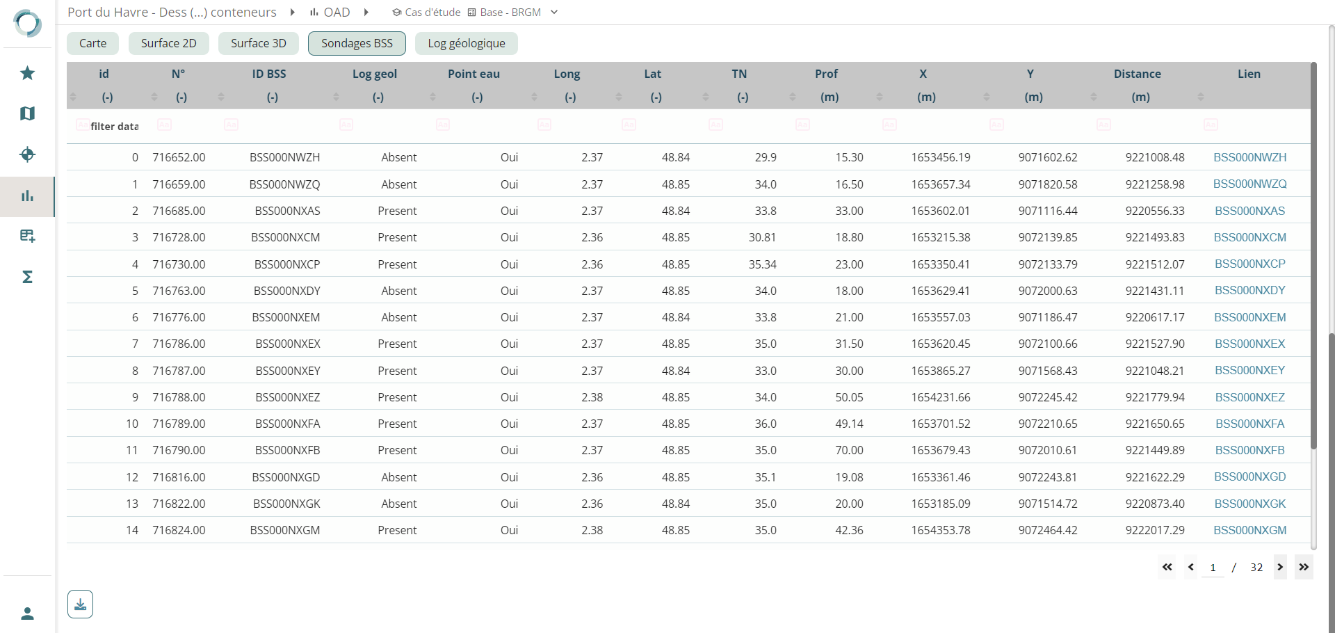 En saisissant les coordonnées de votre projet (🚧 l'import des coordonnées sera bientôt intégré) et en spécifiant un rayon de requête, le module BASE effectuera une recherche dans la Base de données des Sols (BSS) pour récupérer les informations géologiques archivées. Les informations extraites comprennent les sondages d'archives BRGM ainsi que leurs données géologiques numérisées, si ces dernières sont disponibles.