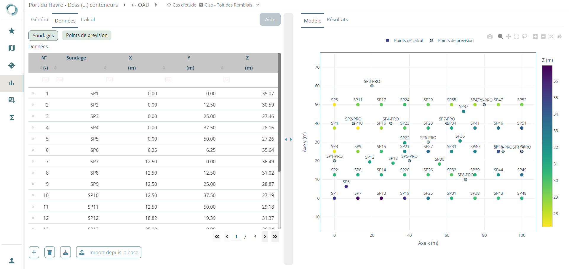 Le module CISO est un outil qui vous permet d'interpoler un nuage de points en utilisant la méthode du krigeage (krigeage simple automatique). Cette fonctionnalité est particulièrement utile lorsque vous souhaitez déterminer la variation stratigraphique d'une couche (épaisseur, niveau toit, niveau base) ou la variation mécanique d'un paramètre mécanique de sol.