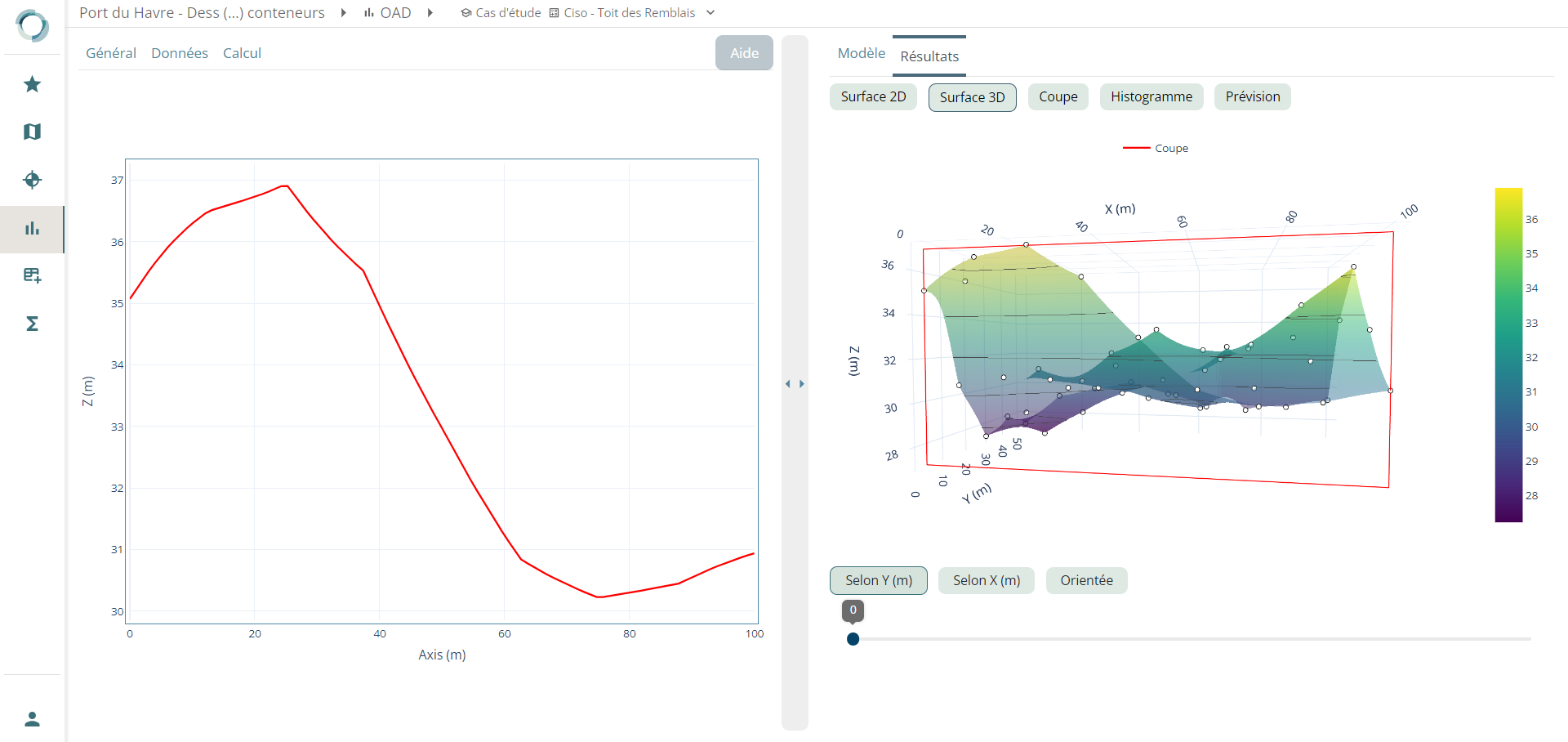 Une fois que vous avez effectué le calcul, le module CISO vous fournit différents résultats. Vous pouvez visualiser la cartographie 2D et 3D. Les résultats en coupe sont également disponibles. De plus, le module CISO fournit des résultats de prévision sur les points de calcul que vous avez sélectionnés.